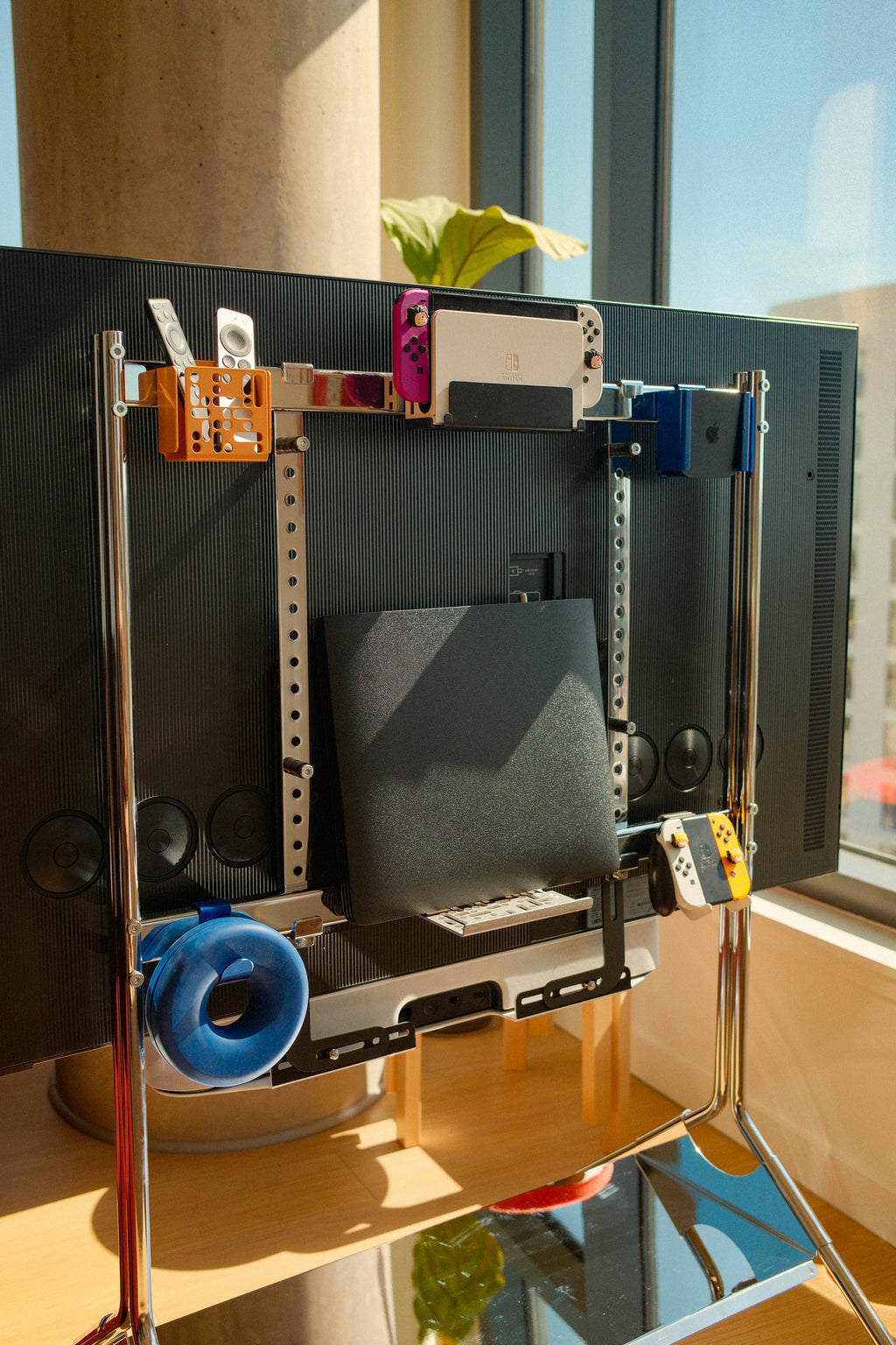 It can be positioned on the stand — completely independent of the VESA holes — and fits almost any soundbar.