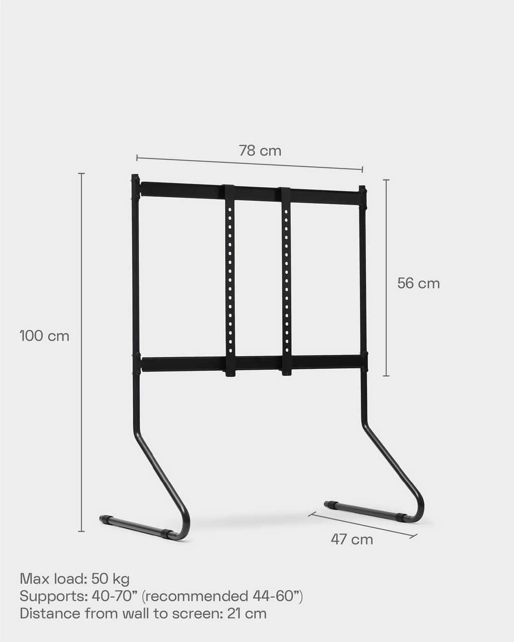 Our TV stands support screens from 32″ to 75″, depending on the model. Please refer to the technical specifications for each TV stand to see details on the maximum and minimum screen size. Screens above or below the recommended size do not align with our quality and stability requirements. If you choose to fit a screen outside the recommended size, you do so at your own risk and responsibility.